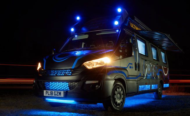 Lounge and game in true luxury comfort with a stylish black leather interior kitted out with spaceship like neon lighting and liquid tiled flooring.