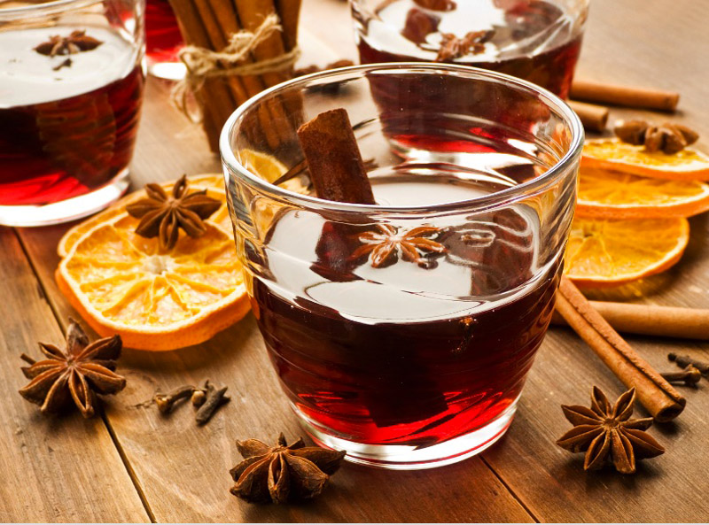 - Mulled wine is served in a double walled cup and garnished with oranges to add to the rich festive flavour