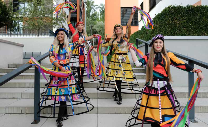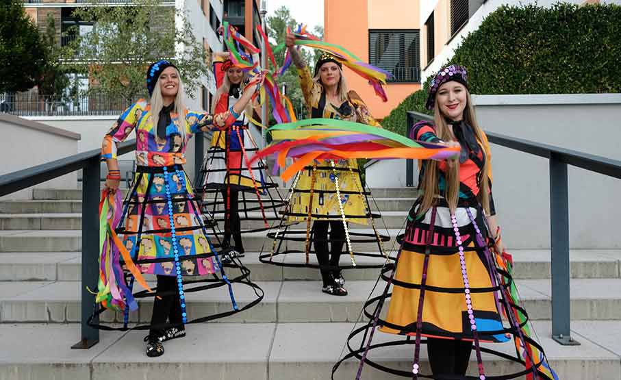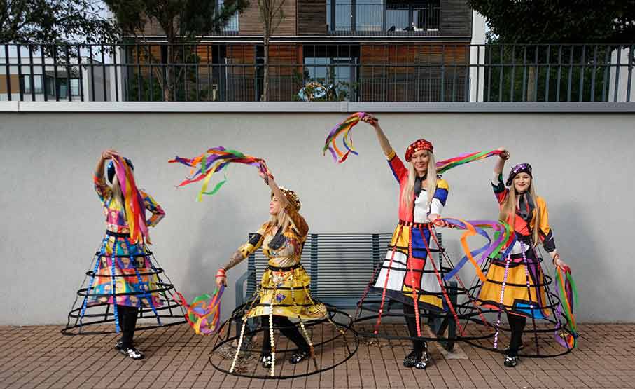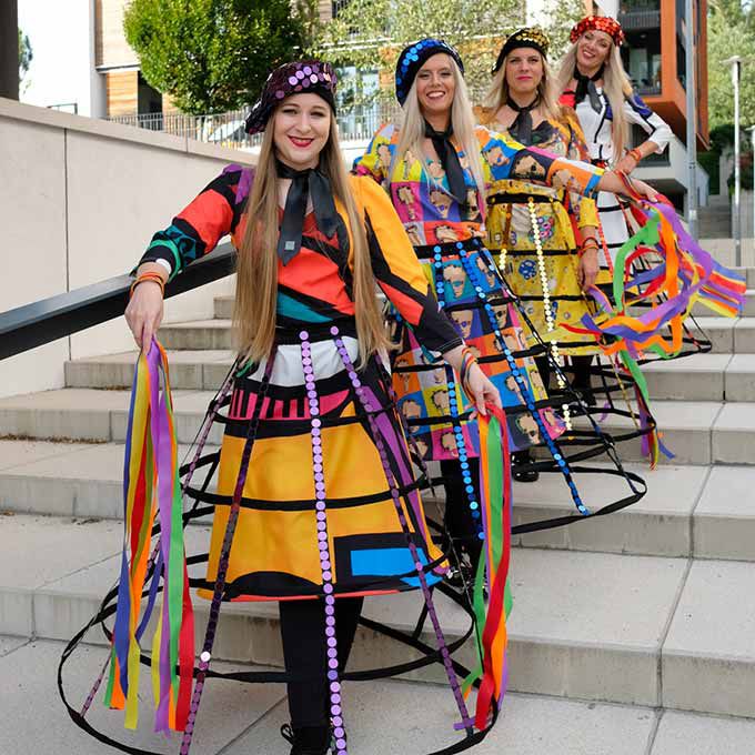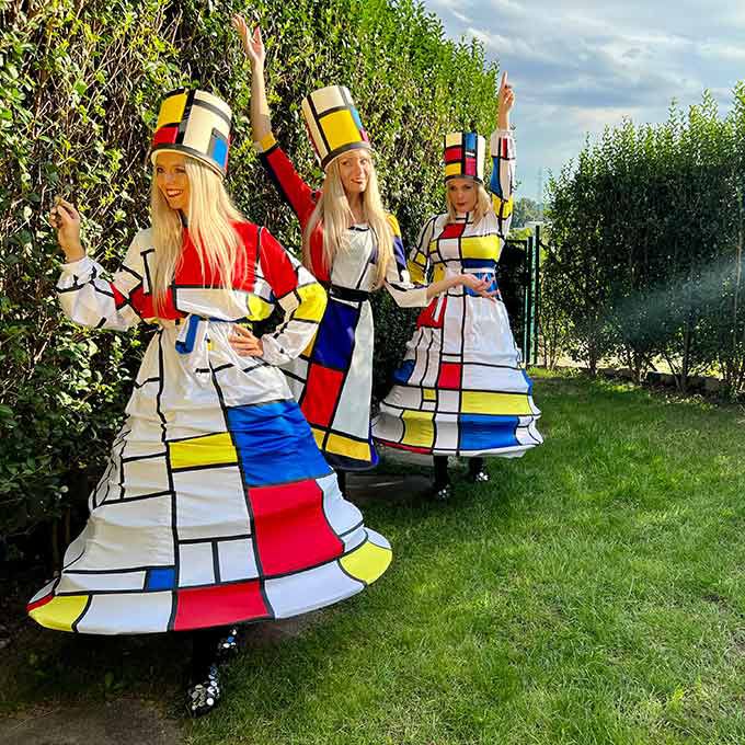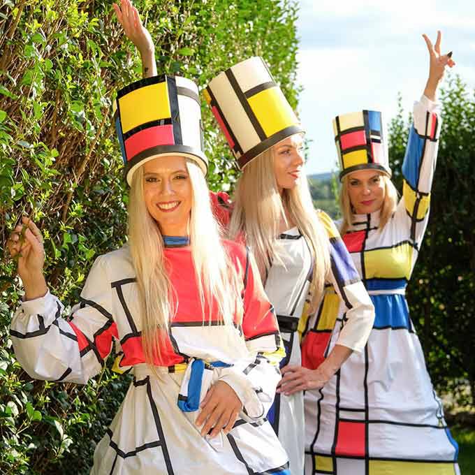 Up to four performers are available with a range of skills and in a choice of vibrantly coloured costumes inspired by popular abstract art paintings