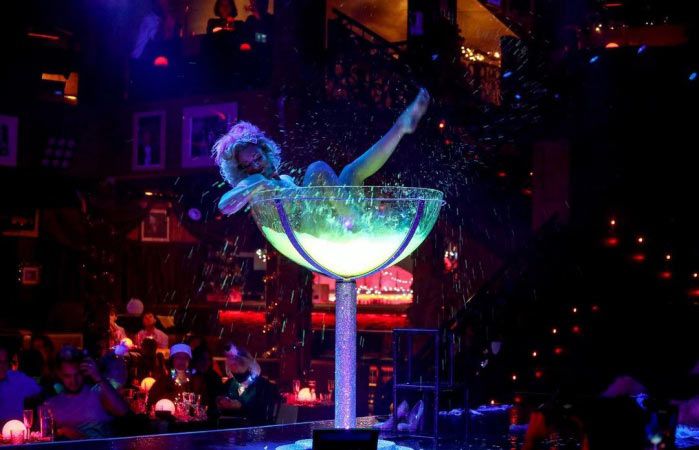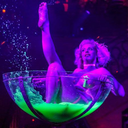 Only used by our fabulous showgirl, she performs an original burlesque dance routine in the classic Martini Glass with a modern look in neon lights