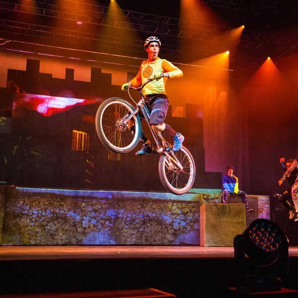 Demonstrating thrilling bike stunts, this daring performer will have you sitting on the edge of your seat with every jump, trick and flip