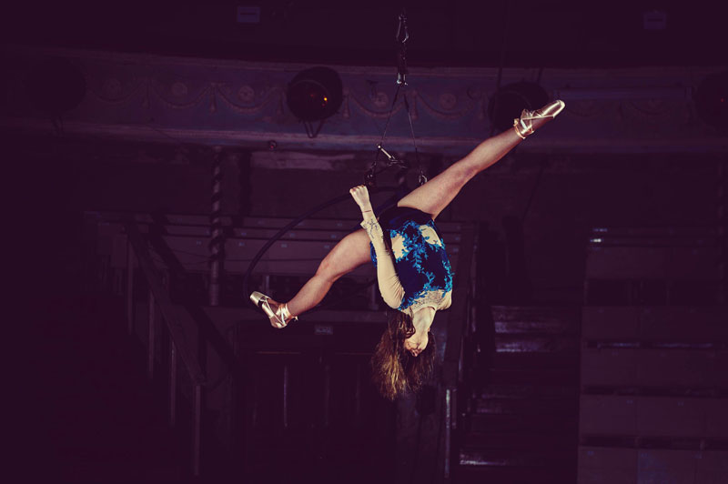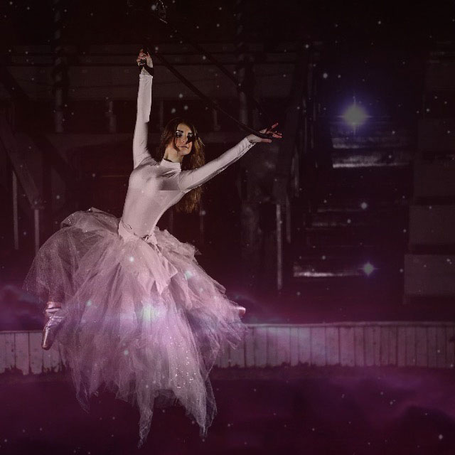 Dressed in a soft and flowing tutu dress or wearing ballet pointe shoes, this extraordinary aerialist adds a certain touch of sweetness to any occasion. Happy to perform as a soloist or with other performers, she can adapt her aerial dance performance to bigger theatre productions or variety shows.