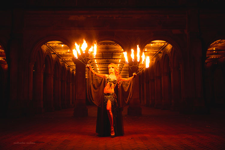 With props such as candelabra, fire, feathers, fan veils, sword, silk poi, wings and more, our New York Belly Dancers ensure that every event is different and thoroughly entertaining. Interacting with guests, posing for photos and welcoming attendees to your event is also available when booking these USA belly dancers.