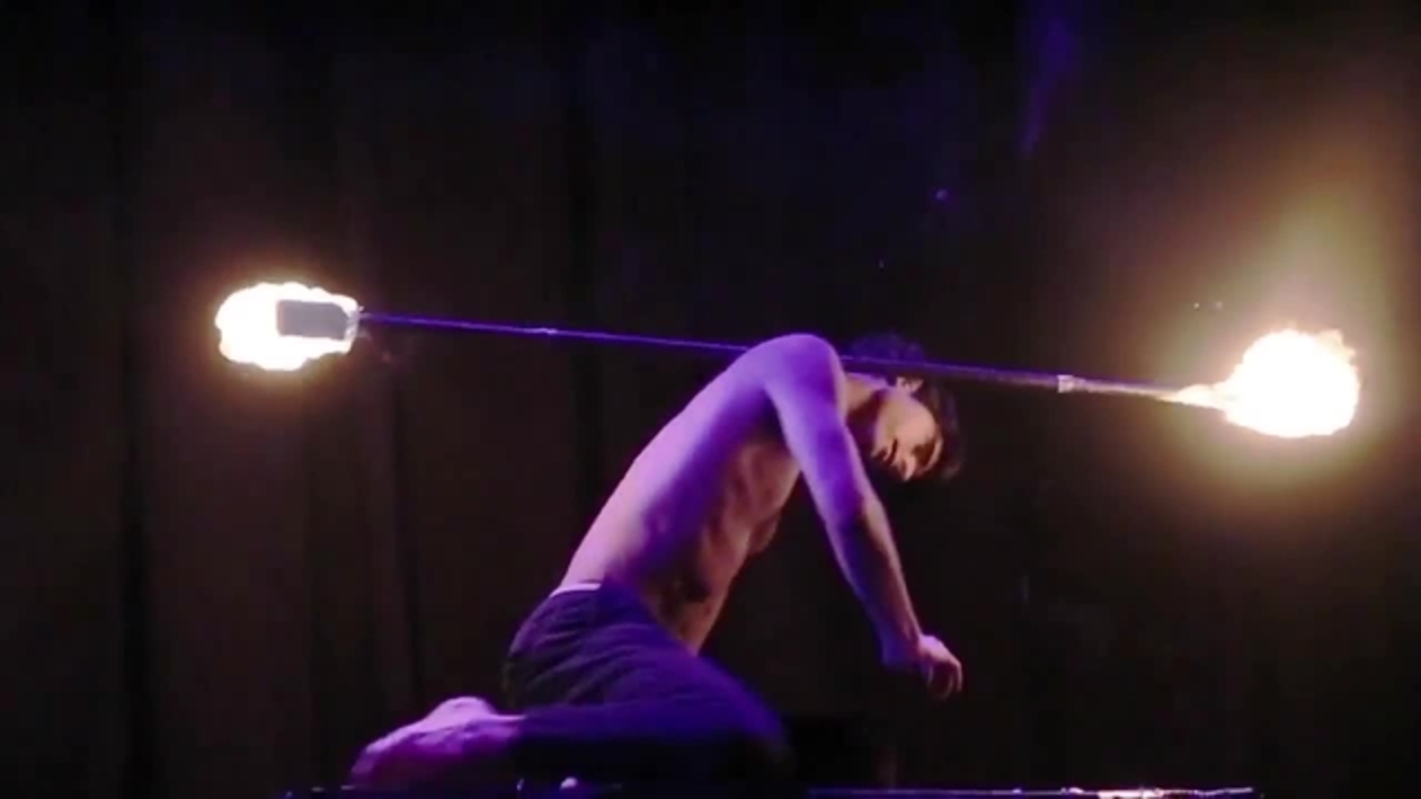 Our New York fire dancer creates patterns and shapes by weaving his props through every angle and plane, manipulating the direction of the contact staff with his body as it rolls over is shoulders and spirals around his neck in a very elegant yet daring manner.