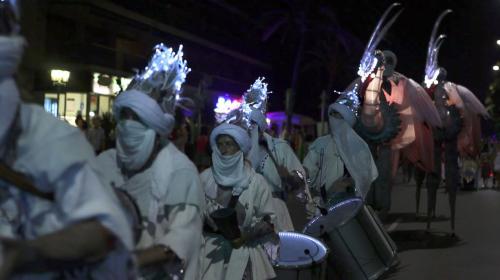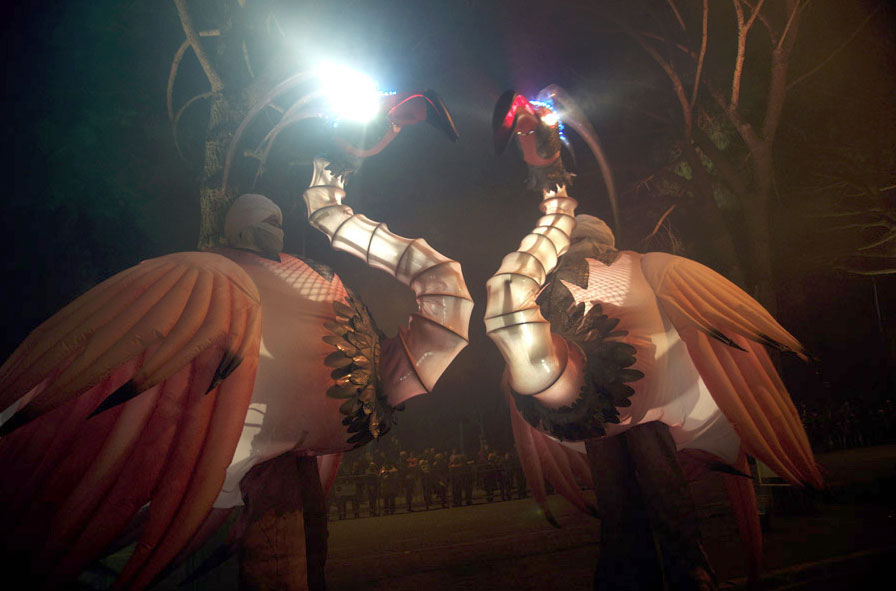 Extraordinary walkabout characters perform with drumming ensemble