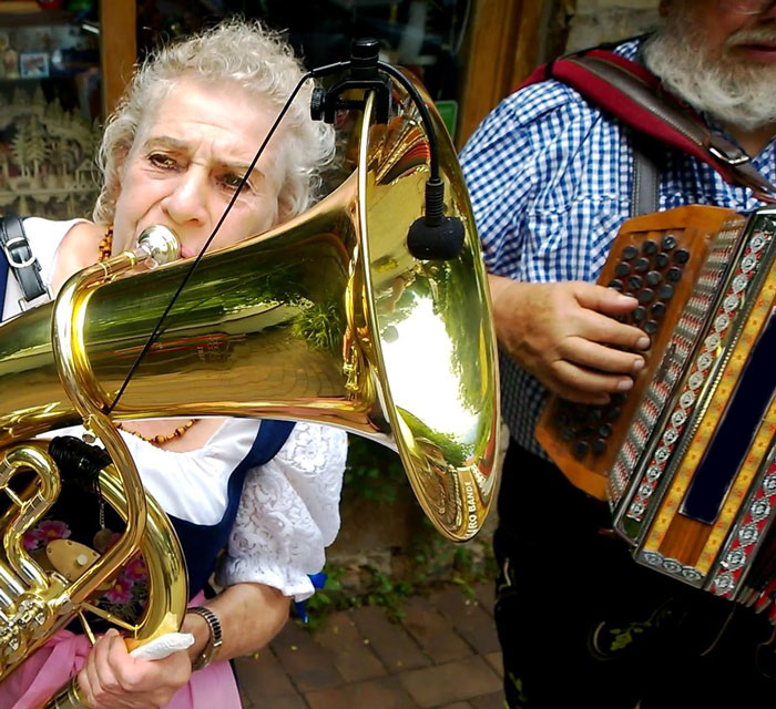 The Bavarian band plays live music in the styles of Ernst Mosch, Slavko Avsnik, Egerland, Slovenian, Bohemia, Bavaria, and from Tirol. An authentic sound of the best known German and Austrian Blasmusik bands. You can expect beer-drinking songs, traditional melodies, their original compositions and lively polkas and waltzes too. This is the type of German music entertainment you would regularly find at various German Oktoberfests. Adding to the authenticity of their live music and suitably fitting costumes, our Bavarian band also speak fluent German.