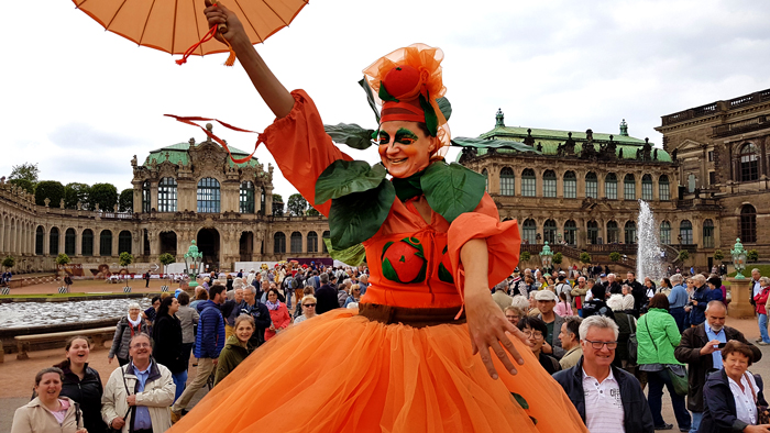 This award-winning walkabout act proudly sports the Dutch national colour. Our Orange Stilt Walkers Amsterdam take their inspiration and pay homage to the Dutch Royal Family that hail from the House of Orange. Combining both the colour and the fruit, these brilliant Dutch stilt walkers have two costumes that resemble and smell like an orange, they even open up to reveal a pith-like interior. The third is an orange vendor character with various fruit references about her costume including over-sized citrus leaves.