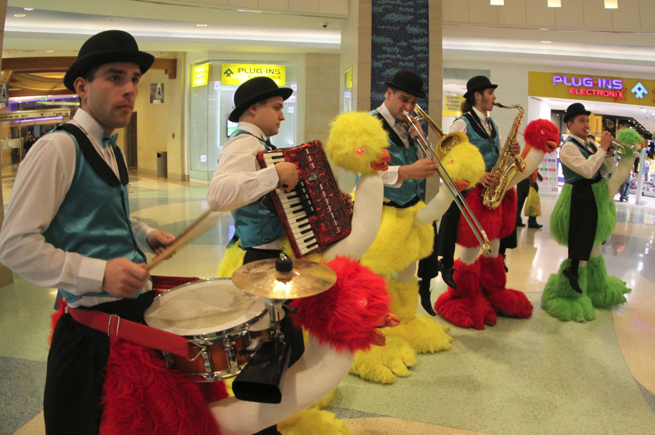 This band combines a high musical standard with theatrical routines, comedy, and precision marching in original handmade costumes. Eye catching, exciting and great fun – the plush bird performers will keep smiles on all your guests faces.