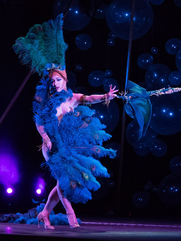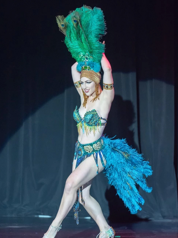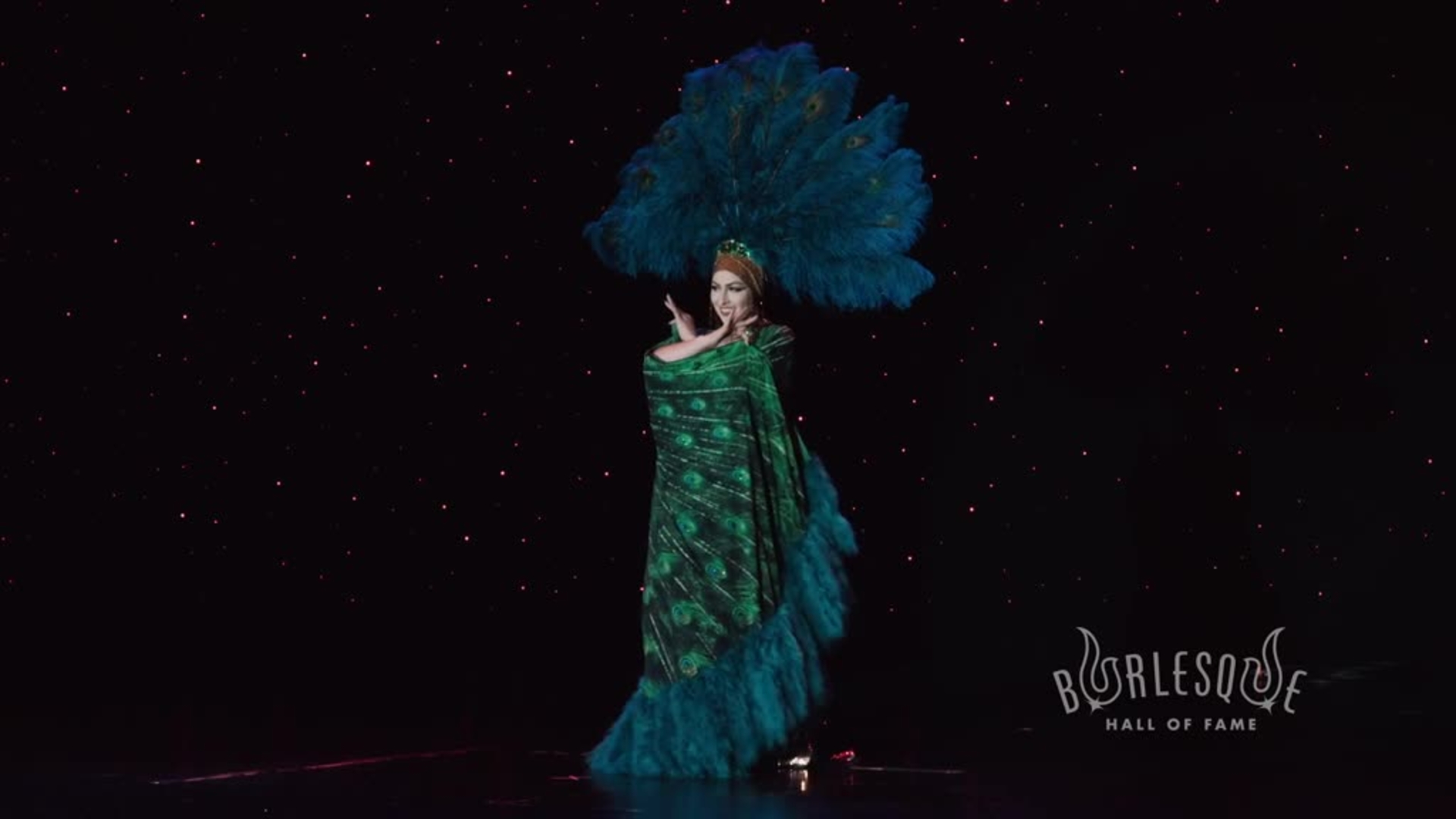 Preening and prancing, this burlesque performer flirts with the crowd as she strips down