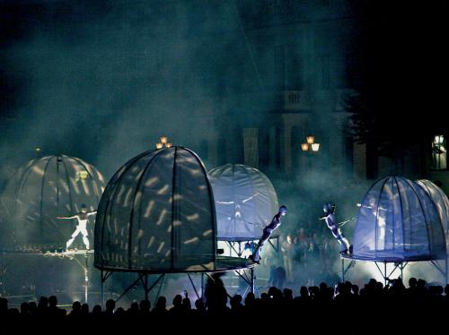 Pi‐Leau is a street theatre production that literally moves the audience. Actors and mobile objects move through and with the crowd. Like the sea people find their way around the emerging obstacles. A unique experience!