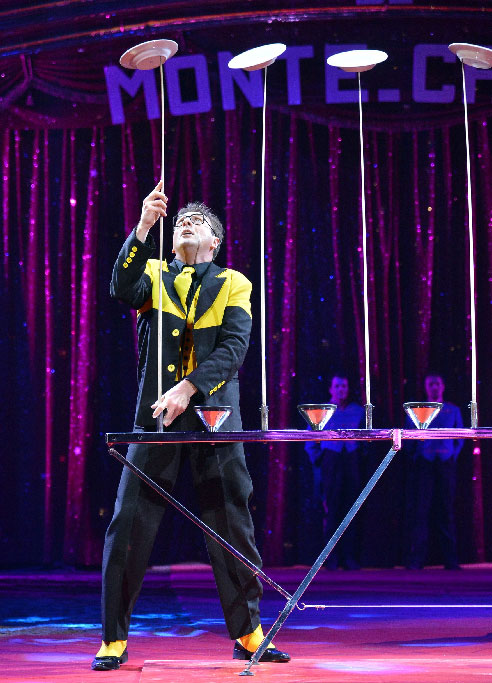 Expertly spins and juggles plates, glasses, spoons and boxes