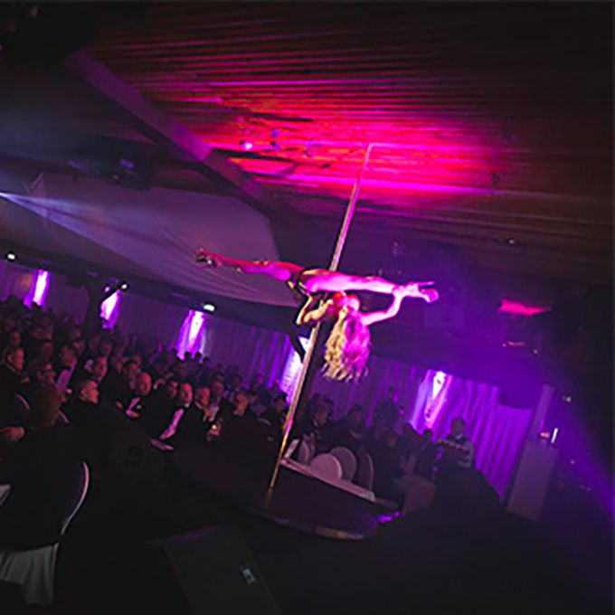 Phenomenal pole dancing routines executed by a highly-skilled dancer and athlete, able to perform ambient routines