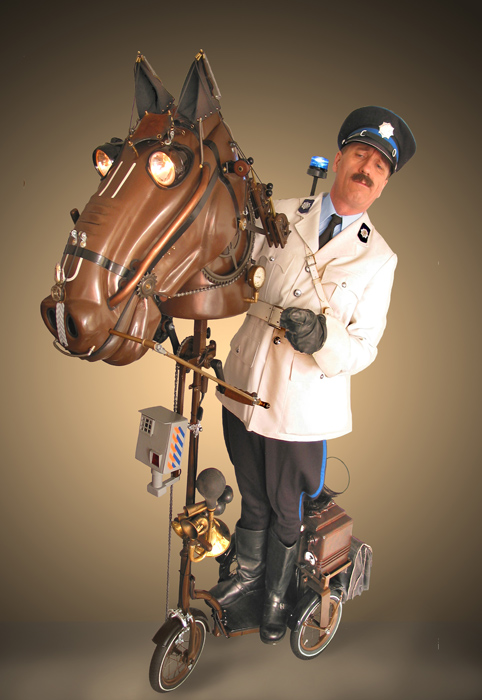 If you’re looking for, outdoor, festival or street entertainment from a walkabout act that gives an interactive performance with crowd engagement, then look no further. Our Policeman and this steam powered horse is a show stopping roaming character that captivates his audience perfectly. This kind of street entertainment is suitable for audiences of all ages.