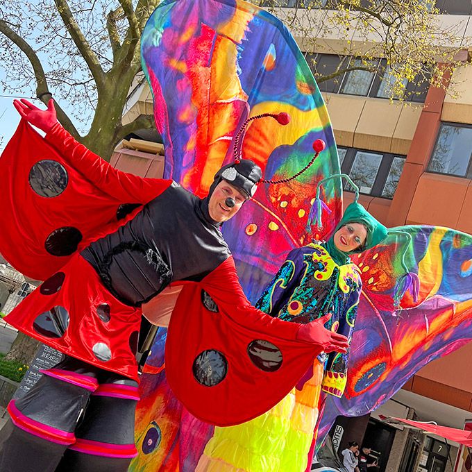 Shimmering with flower like qualities, our fun roaming characters are ready to conquer your event with their bubbly personalities and friendly nature, a witty pair of stilt walkers that guests of all ages will love instantly. Our magical creation is bound to leave your special event or gathering with a resounding lasting impression that will result in your guests laughing and feeling full of joy. The perfect walkabout entertainment option for festivals, family days, street performances, private parties, gala dinners, and more.