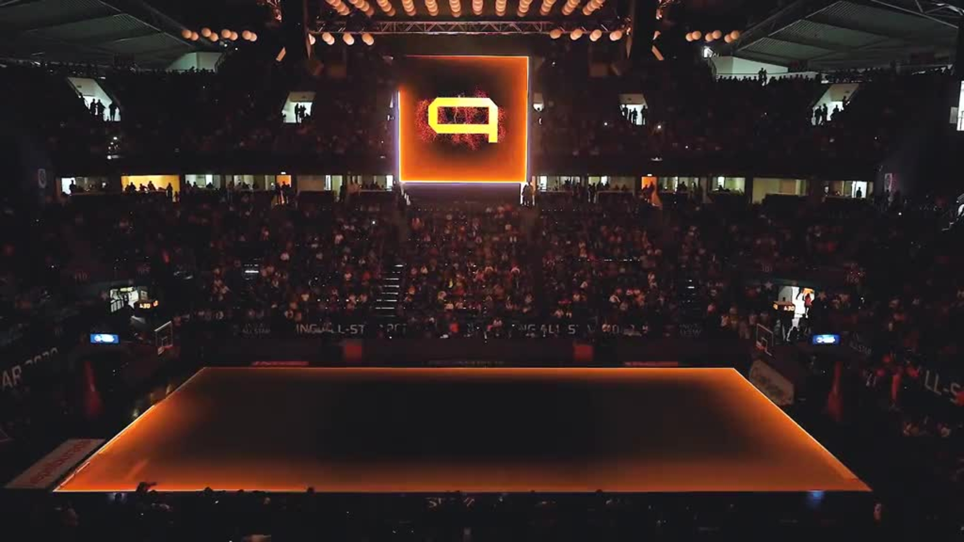 The basketball court acts as a canvas for detailed animations to be projected, while a performer appears to control the visuals for dramatic effect