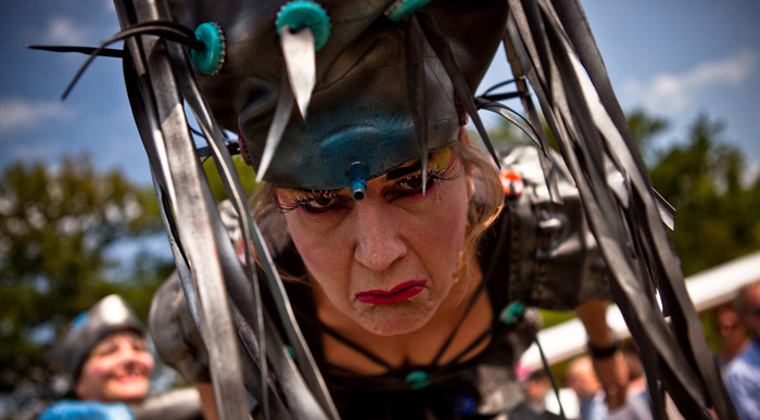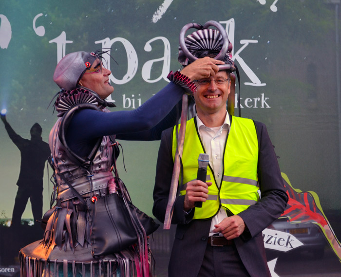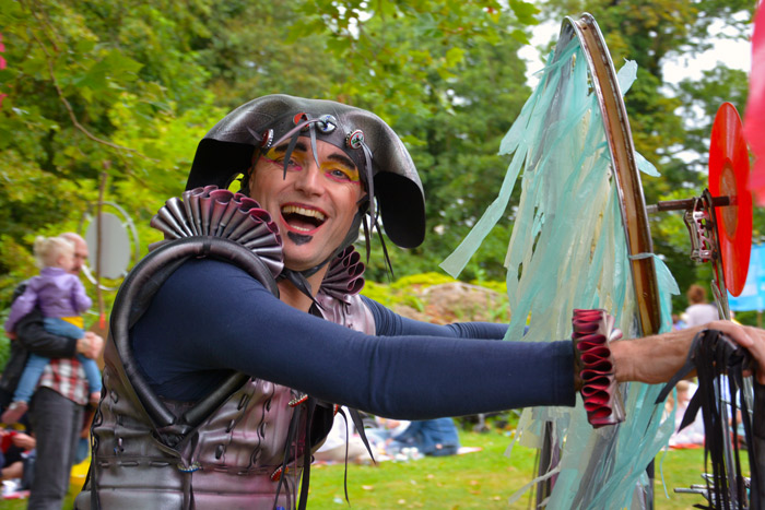 Two stiltwalkers come with a mobile throne made of recycled objects and aim to spread messages of recycling with fun antics