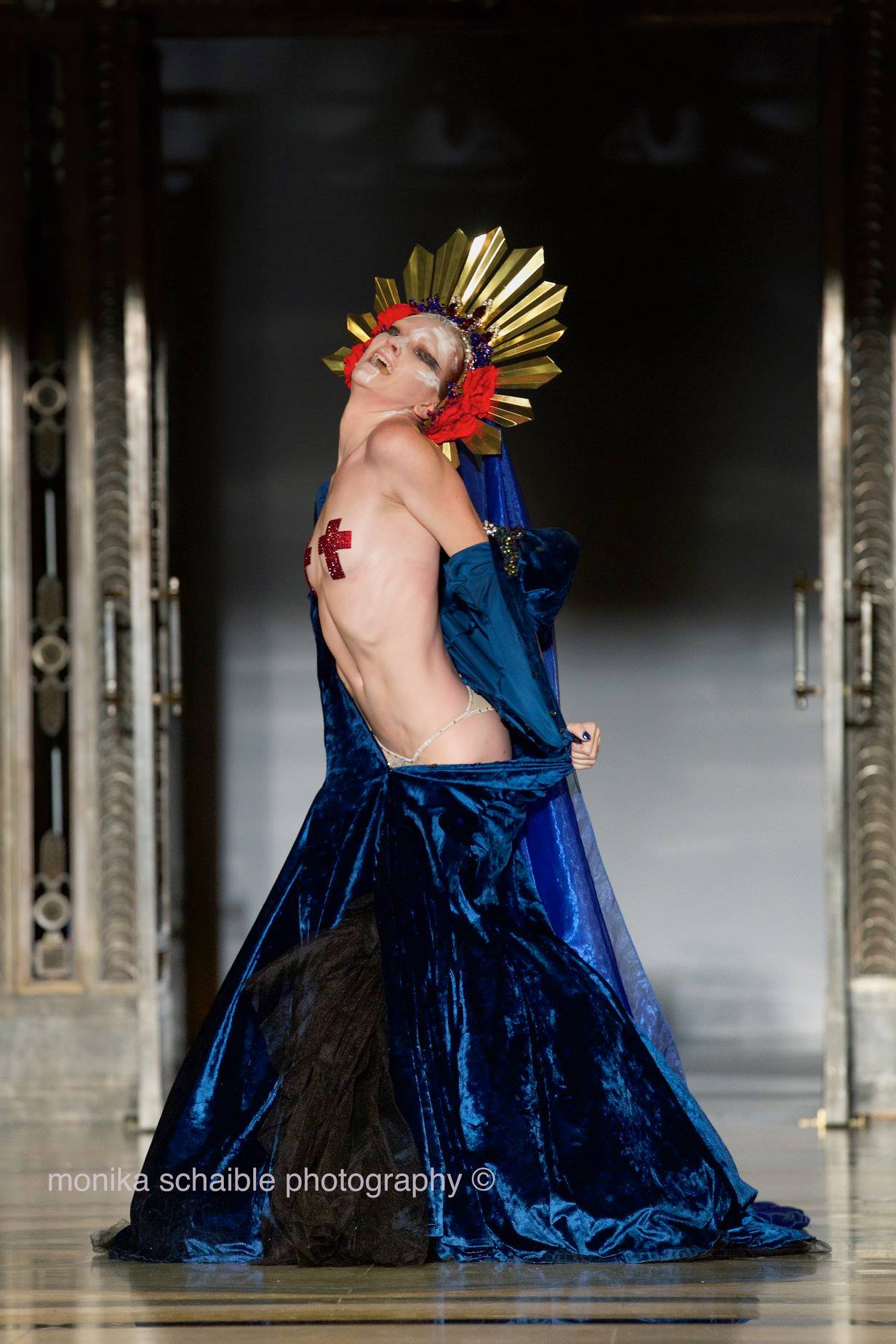 Performers fill the stage with religious iconography and symbolism to pay tribute to one of the most influential fashion designers of all time