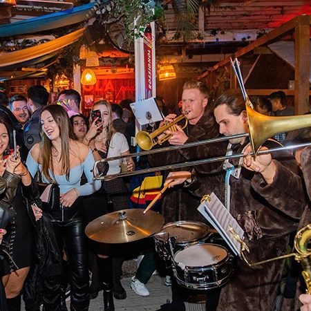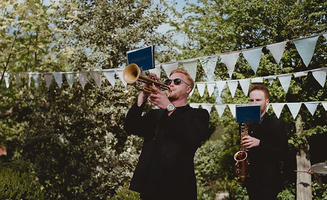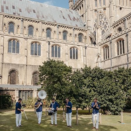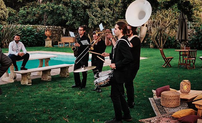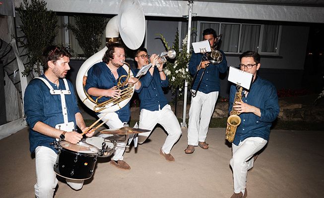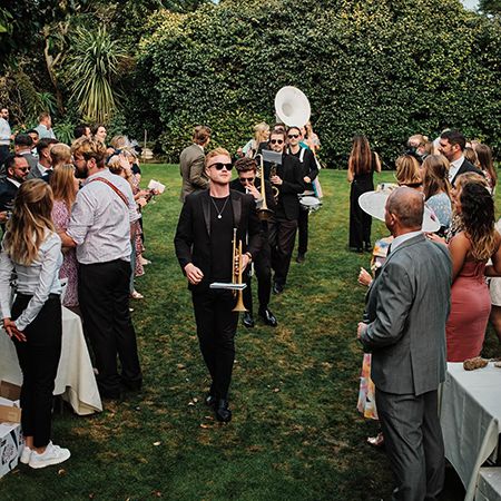 These brass musicians are available in roaming or staged formats, from surprise entrances and outdoor receptions to full headline party sets