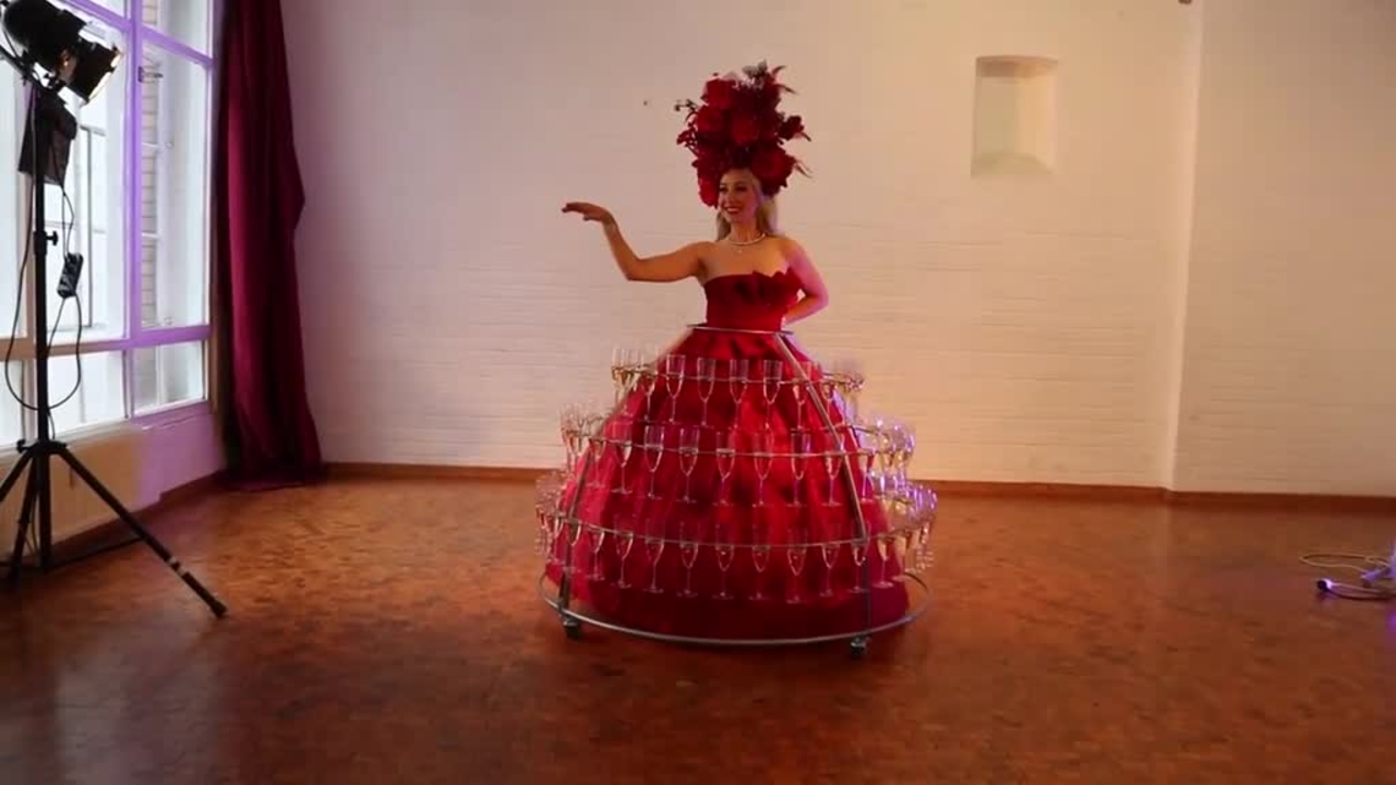 Our stunning champagne girls can serve up to 97 flutes and fill them with a choice of drinks or food and adjust the costume to compliment your event