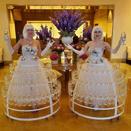 A fun and unique way to serve drinks at your Champagne reception, these glamorous roaming characters glide amongst your event guests
