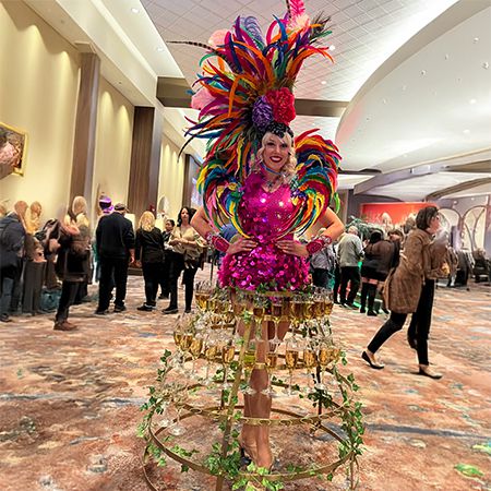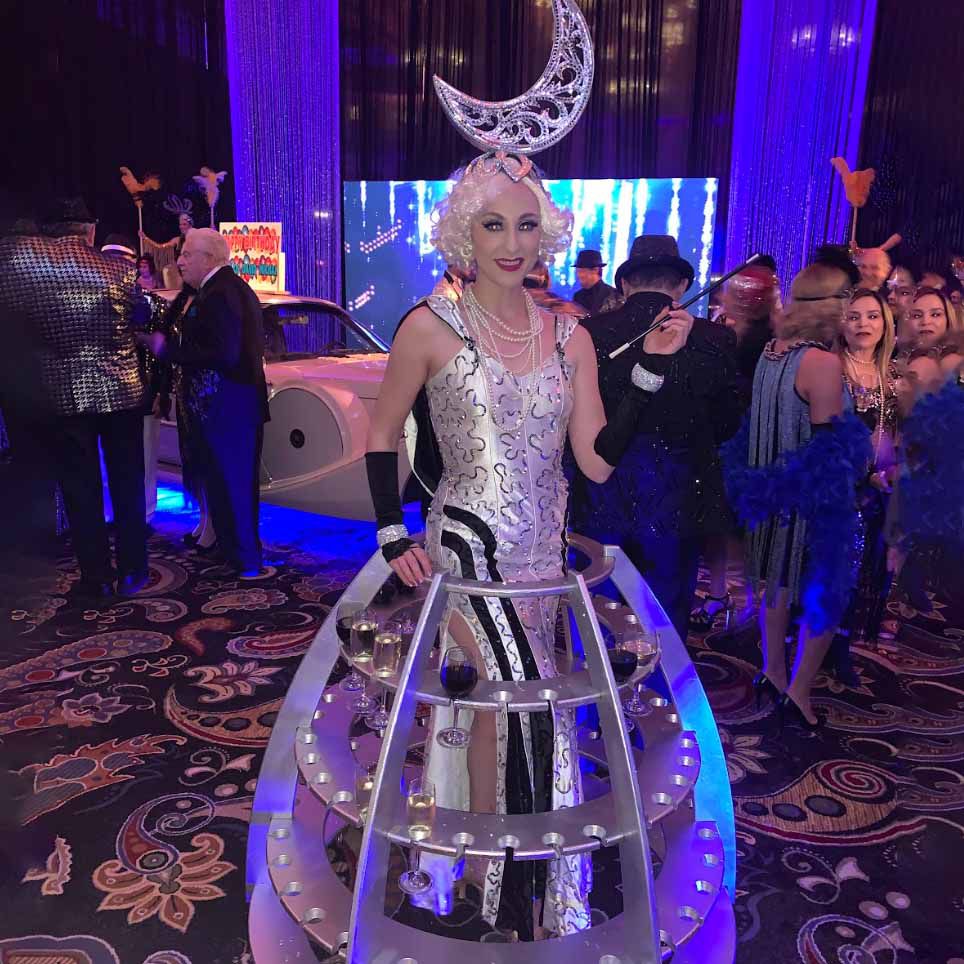 This stunning champagne skirt hostess is a perfect walkabout entertainment option for weddings, corporate or private parties, gala dinners and more