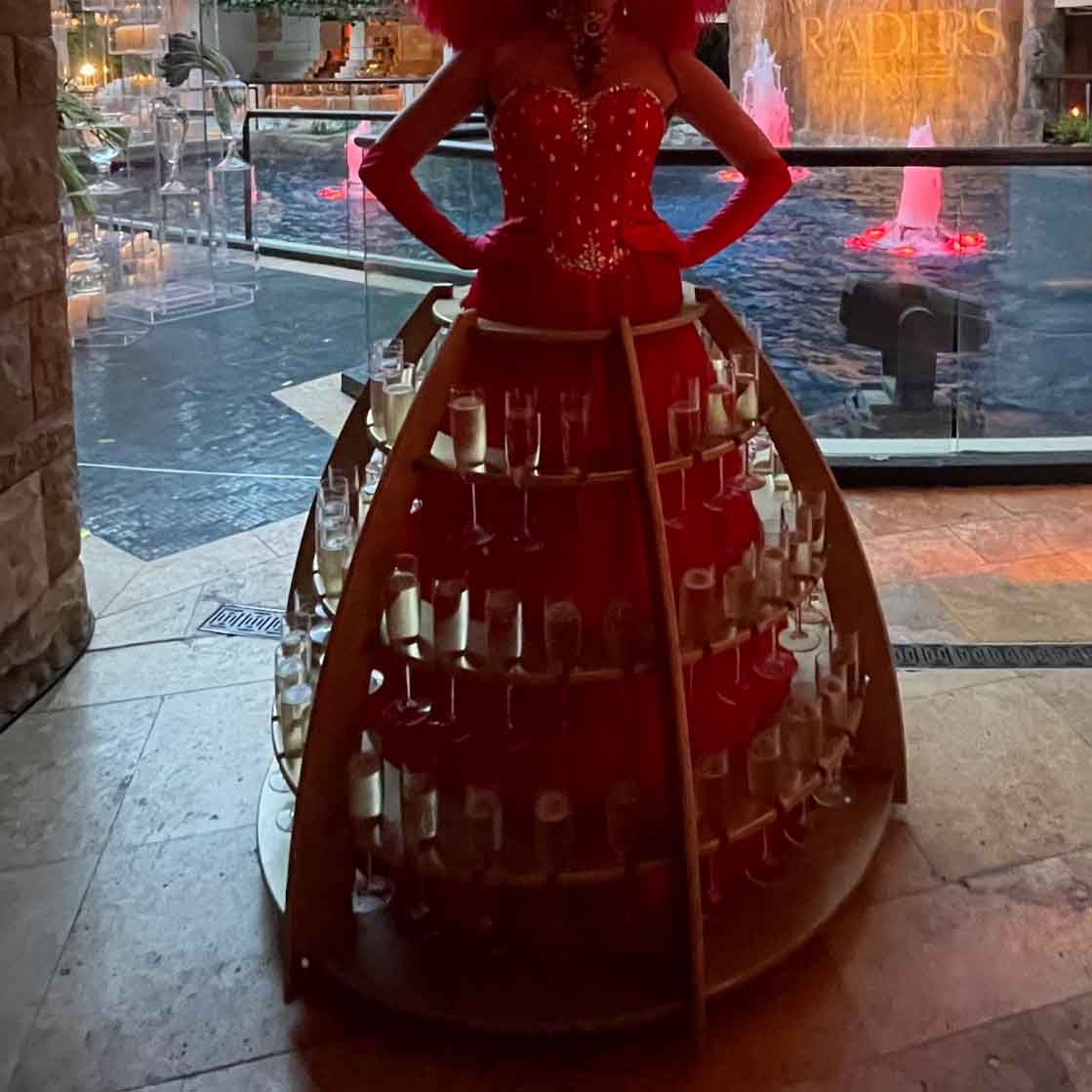 Based in Las Vegas, our Roaming Champagne Dresses are available to hire throughout Nevada and across the USA