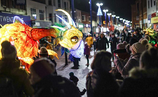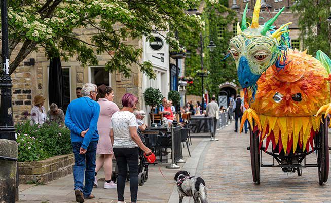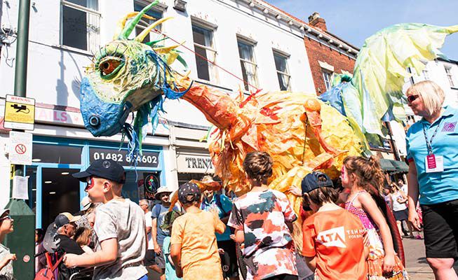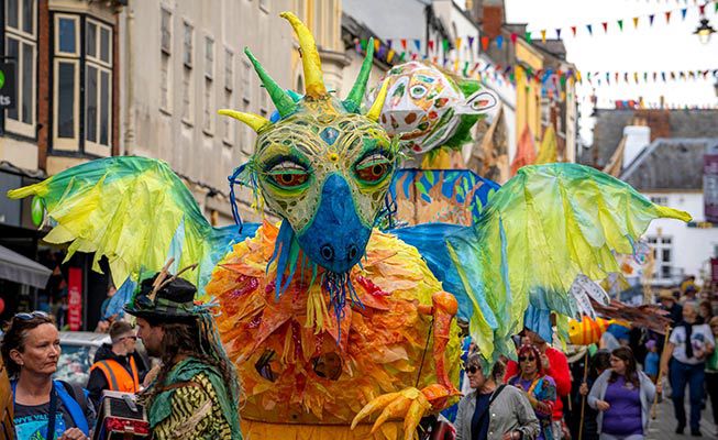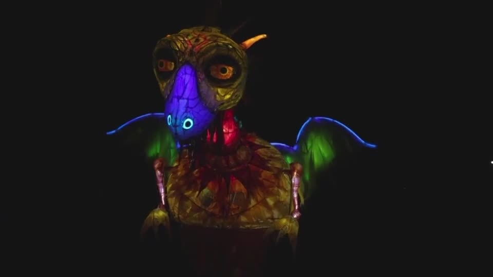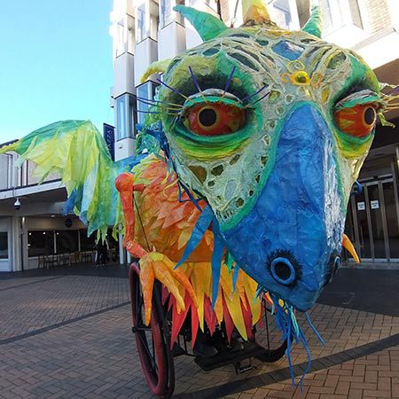 Our stunning roaming bird puppet looks wonderful day or night. With rainbow plumage, he can rise to 3m tall and has animated claws, head and eyes