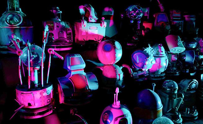 Leaving their cyberpunk world, these robots no longer have jobs so now look for things to do -from therapy bots, mechanics, and make-up droids