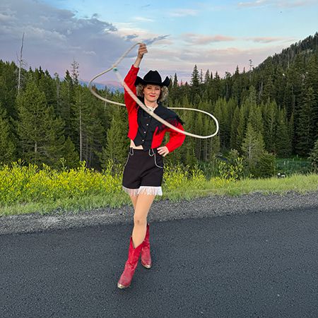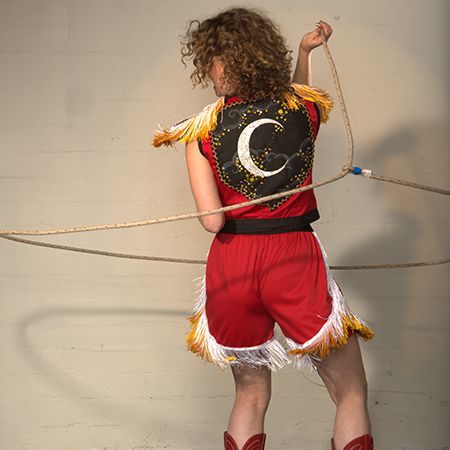 With club juggling and skating well under her belt, she has added a western twist with trick roping in custom-made roller skate cowboy boots