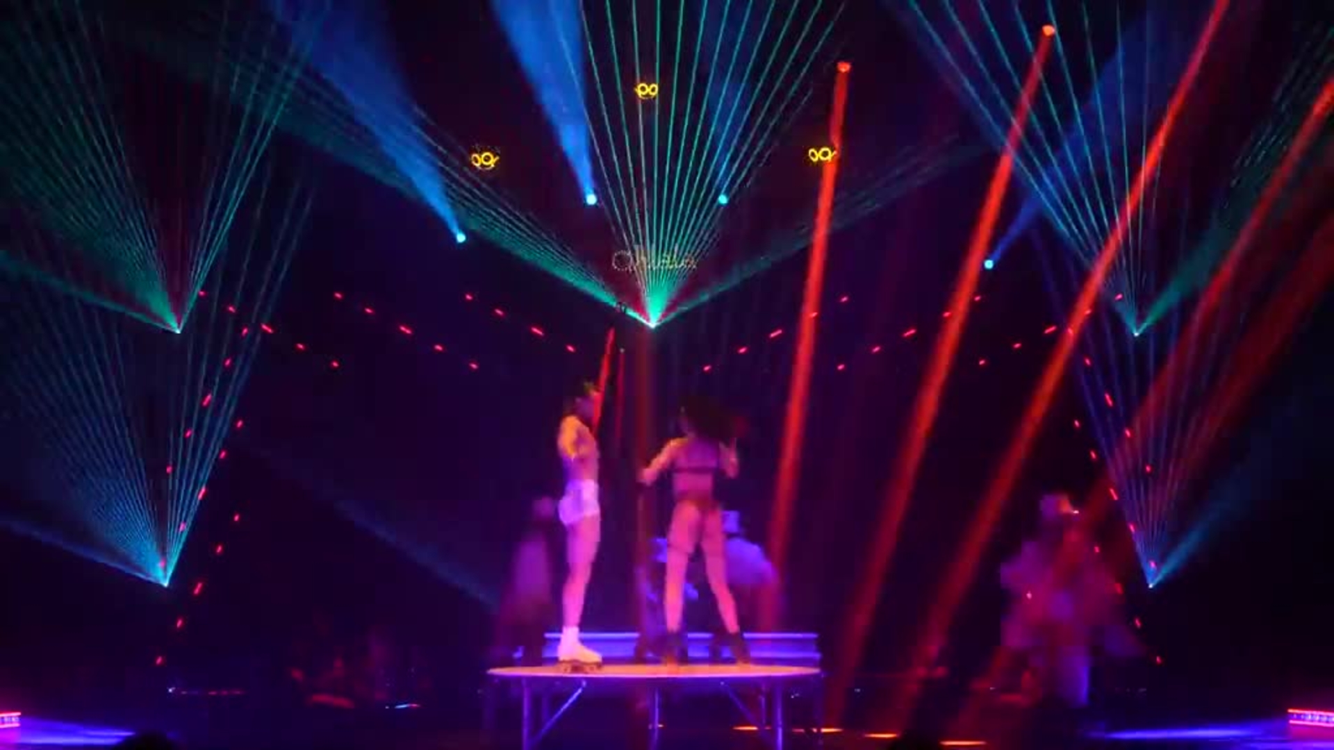 Our roller skaters deliver a performance on the ground and in the air, with a finale where she spins around his neck amidst a display of fireworks