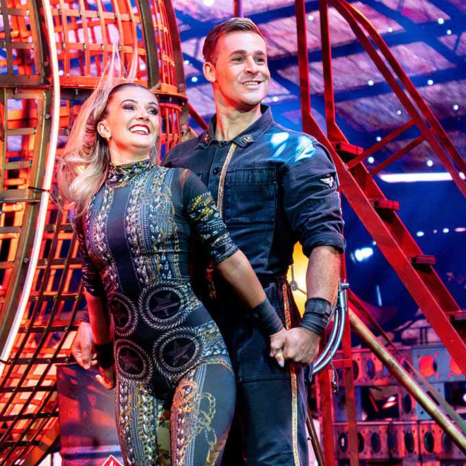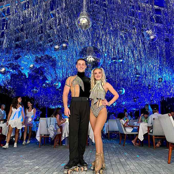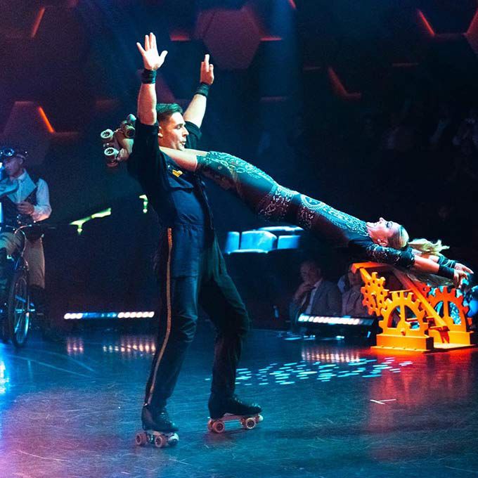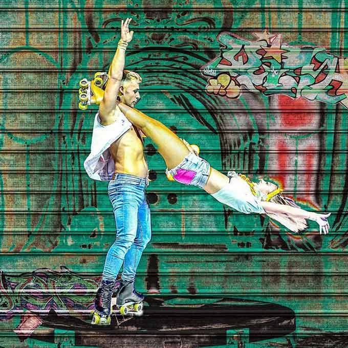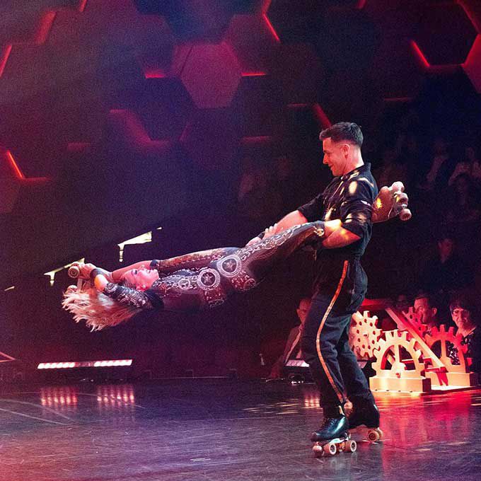 Our breathtaking acrobatic roller duo seem to defy gravity with their amazing spins and daring choreography