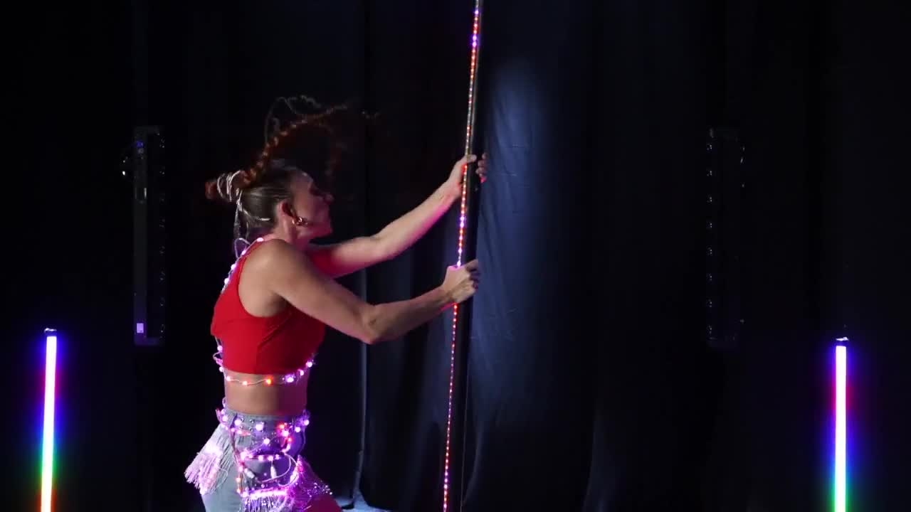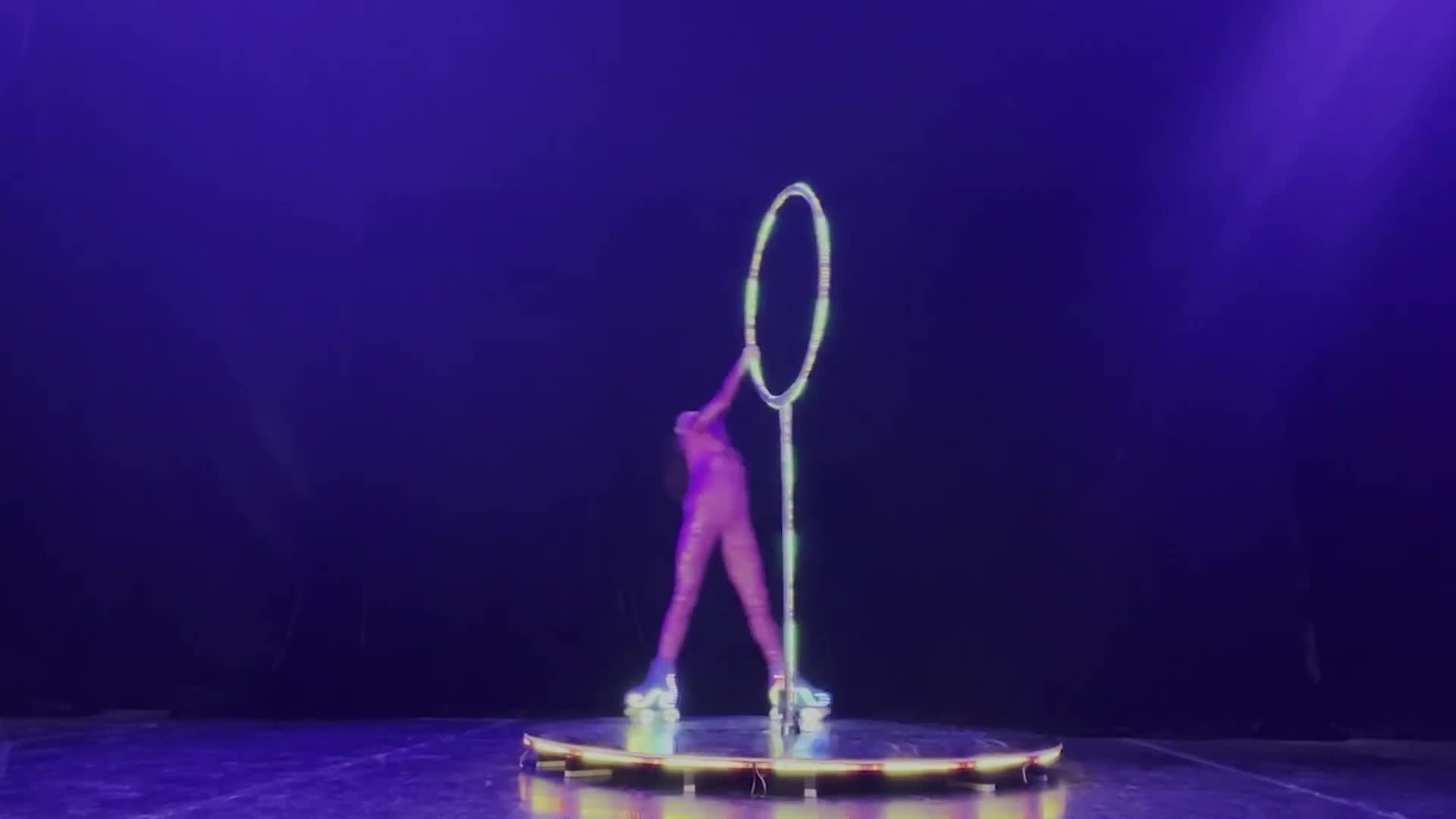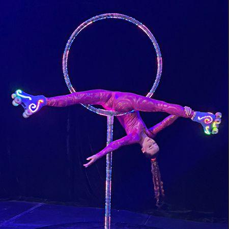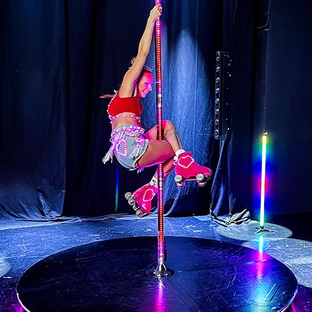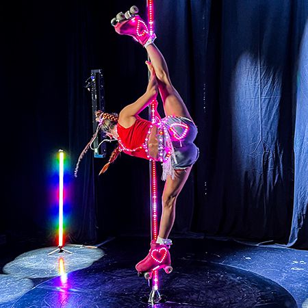 The ultimate blend of retro and contemporary, these LED dancers wear light-up skates as they perform acrobatics on a freestanding pole or hoop