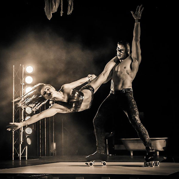 Our incredible roller skating duo are highly experienced and talented acrobats who perform a range of acts to amaze and entertain audiences. This roller skating dance show takes place on a small circular stage which our husband and wife team skate round at dizzying speeds, flipping and spinning each other in an intense and nail biting performance audiences won’t be able to take their eyes off. This dynamic, high energy roller skating act is great for a wide variety of settings from cabaret shows and theatres to night clubs, and given the portable nature of the stage it can be performed anywhere, even outdoors.