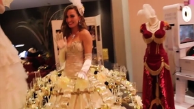 Unique roving champagne dress WOWs guests as our beautiful strolling server glides around venues accompanied by a huge skirt stocked with champagne