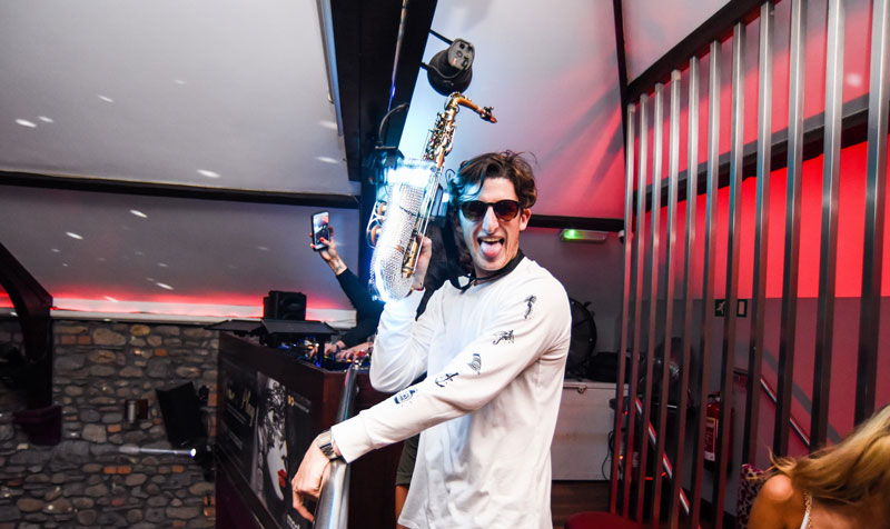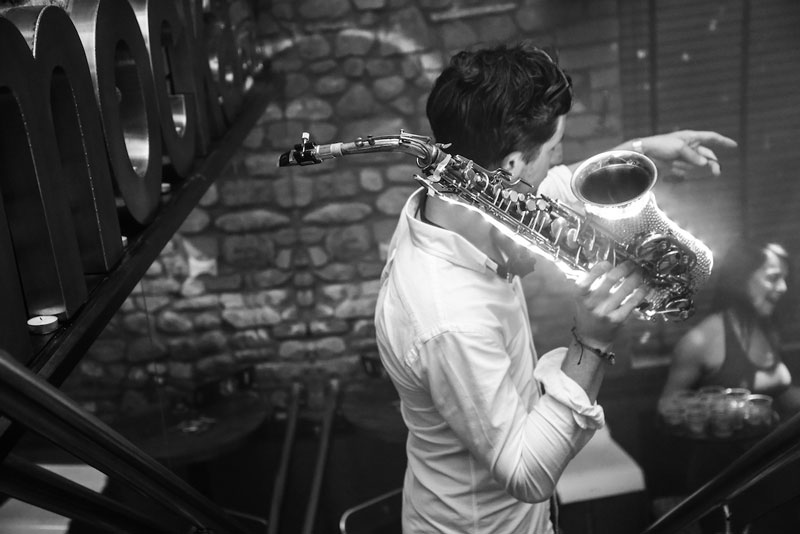 Dressed down, our male saxophone player adds an edgy cool vibe to any club or party scene.