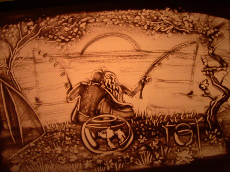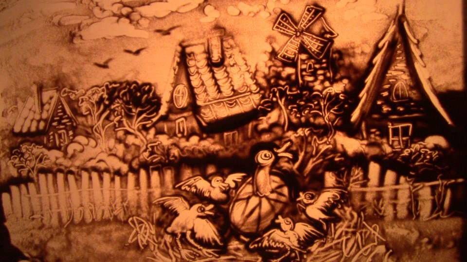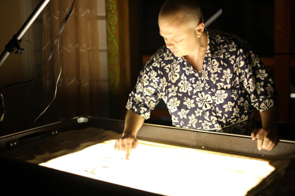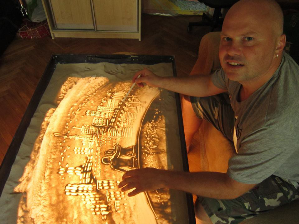 Oleg uses an artistic process which is achieved by applying sand to a backlighted glass table and then translated by drawing lines and figures in the sand to depict a story to series of images.