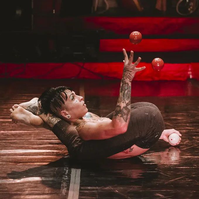 Combining contortion with juggling and additional circus skills he provides flexible entertainment and a variety of cirque-skilled sets