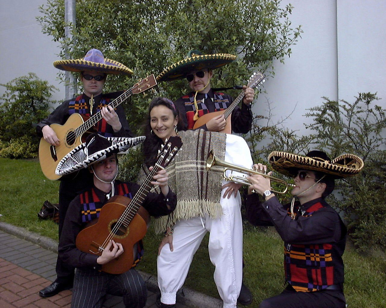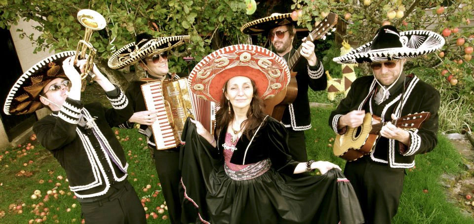 Scotland's premier Mexican fiesta outfit are based in Glasgow but regularly play at all sorts of events throughout the UK . Mariachis are traditionally acoustic bands originating in Jalisco, and are hired for all events - weddings, parties, fiestas, serenades. Recognisable by their distinctive sound, sharp suits, and fancy sombreros, typical songs are rancheras (Cielito Lindo), fast polkas (Adelita), and ballads (Ella).