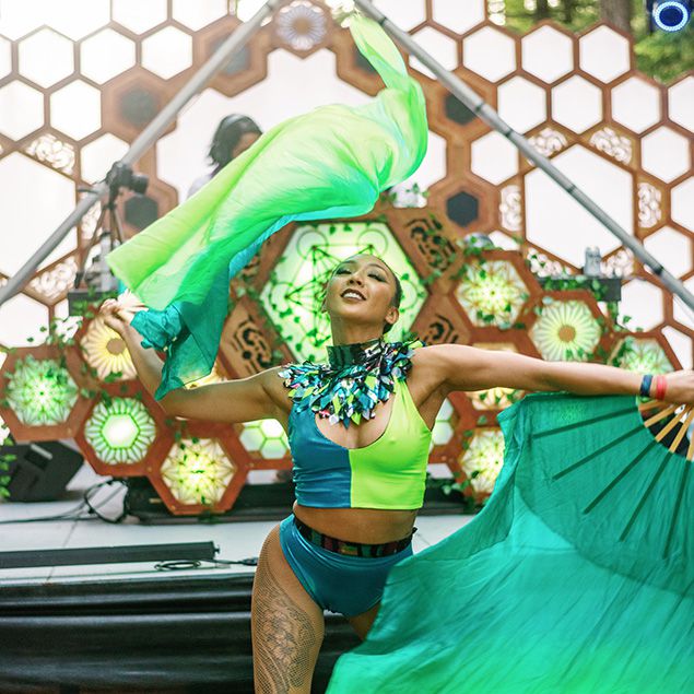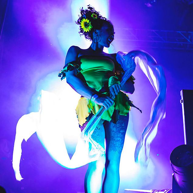 Her silk fan dance act weaves graceful movement with mesmerizing artistry, captivating audiences and leaving them in awe