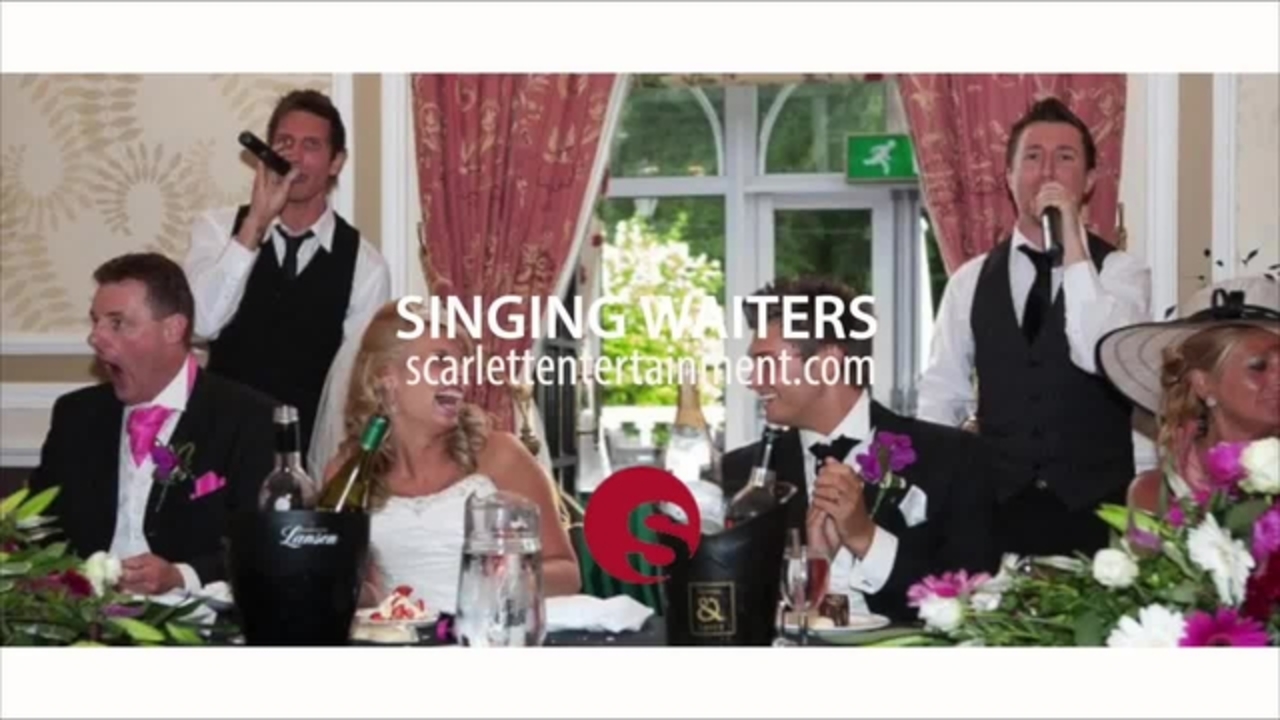 " You made our wedding rock and was so discreet that our guests had no idea who you were and when you burst into song they were shocked. We have been told we threw “the Best wedding ever and those singers we excellent”, some people wanted to get remarried just so you could sing at their wedding. If anyone was considering using you for any event then they should consider no more. They would go a few million miles before finding anyone that can come close to you guys. I would really recommend Singing Waiters to anybody. I think they were great value and of all things we arranged for the wedding this was the best.Thank you again "