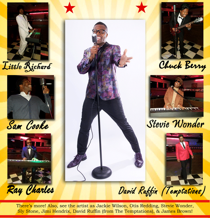 This exciting 90 minute stage production celebrates the pioneers of rock and soul, including Little Richard, Ray Charles, Sam Cooke, Chuck Berry, and seven more Roll and Rock Hall of Famers such as; James Brown, Otis Redding, Jackie Wilson, Stevie Wonder, David Ruffin, Sly Stone, and Jimi Hendrix.