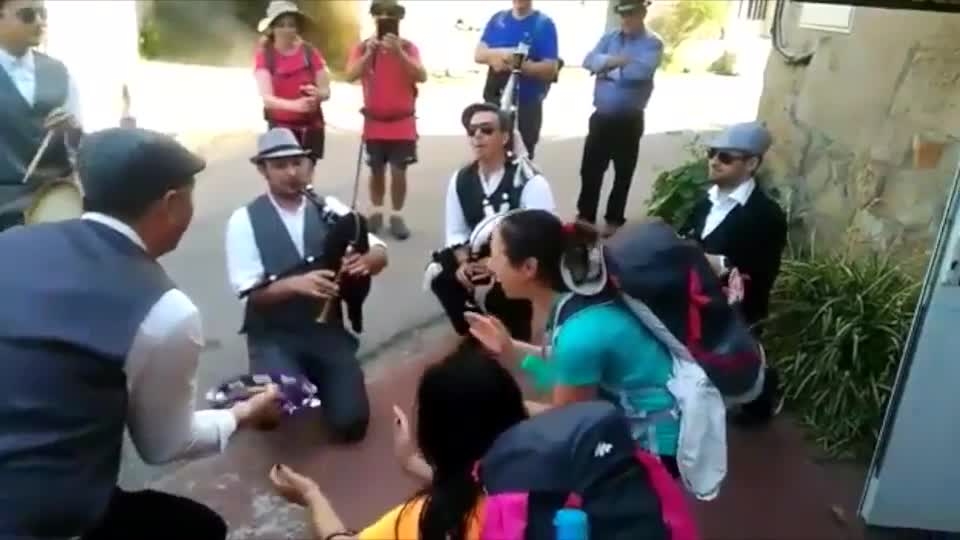 Collective of walkabout musicians playing traditional folk music of Galicia led by bagpipes