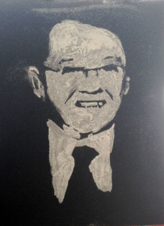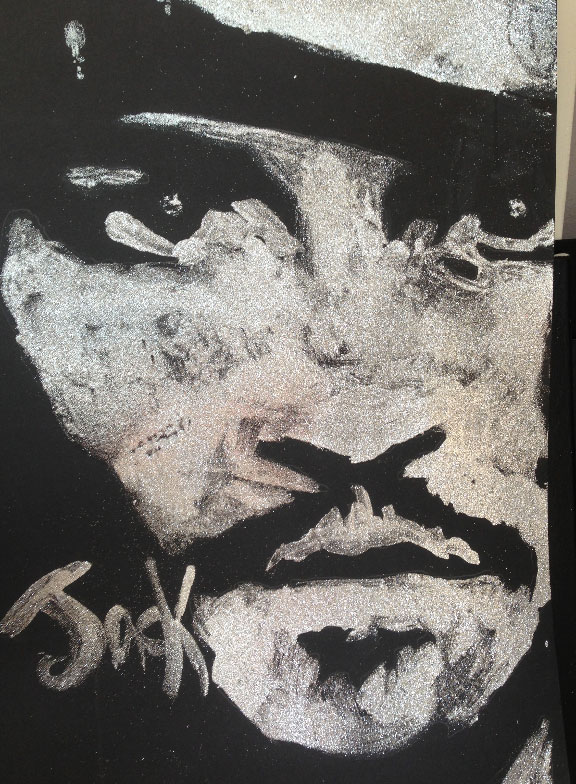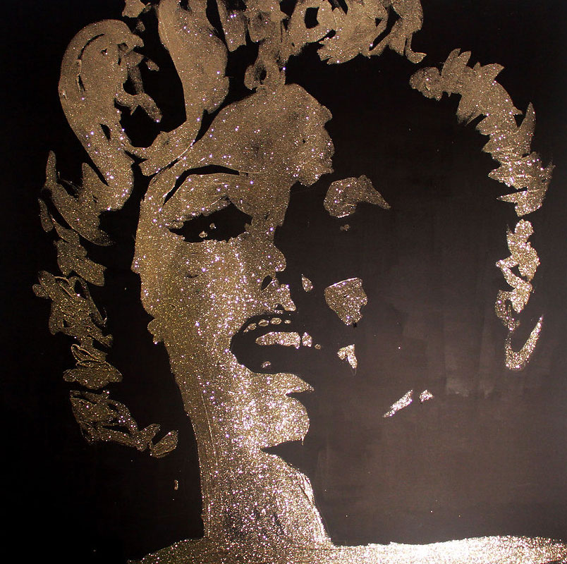 Painting throughout the performance using clear glue, it is only for the big finale, when the artist throws glitter on the canvas, that the audience see the portrait or graphic appear and really come to life.