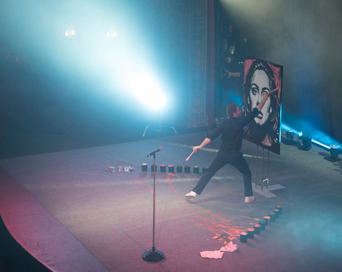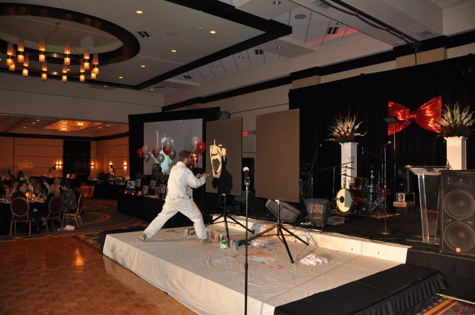 Our American Speed Painter is a nationally touring artist who paints celebrity and patriotic portraits live in front of a crowd. Each painting takes roughly 4-7 minutes and the whole experience is set to music. He presents a fun, high energy, fast paced corporate show which will WOW your audience from start to finish. Not only will your audience love the painting aspect of this show, He is also quite funny. Your guests will find themselves laughing often and they might even get to be part of the show. He involves the audience quite a bit and really makes sure they enjoy the event. It is not only a show, it is an EXPERIENCE that will be talked about long after viewing.