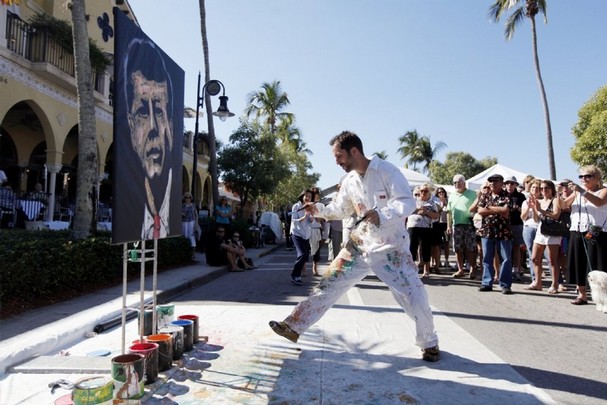 " “Speed painter [...] does large portraits of the famous at lightning pace” "