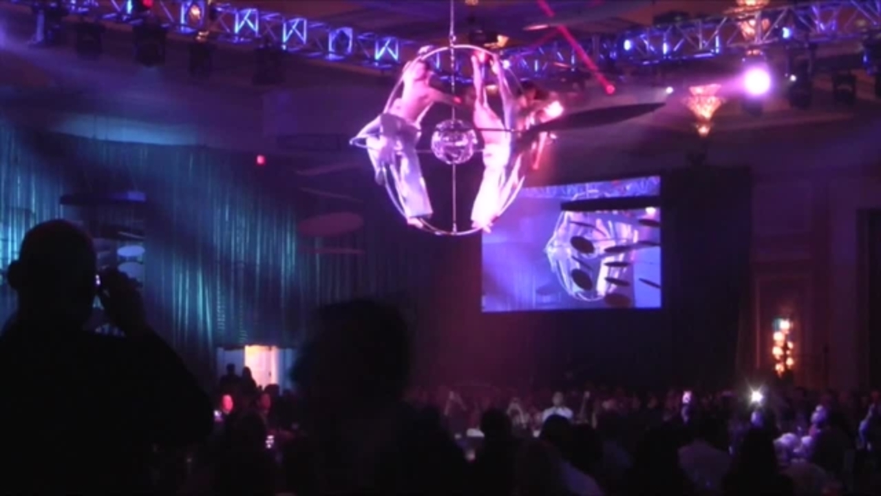 Performing on a custom made rig that has been engineered to look like a sphere within a sphere, these aerial dancers put on an extraordinary aerial performance showcasing elegant balances, and impressive feats of strength.