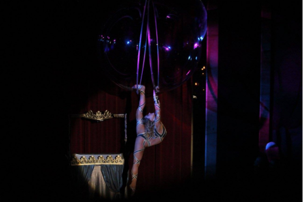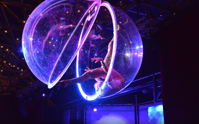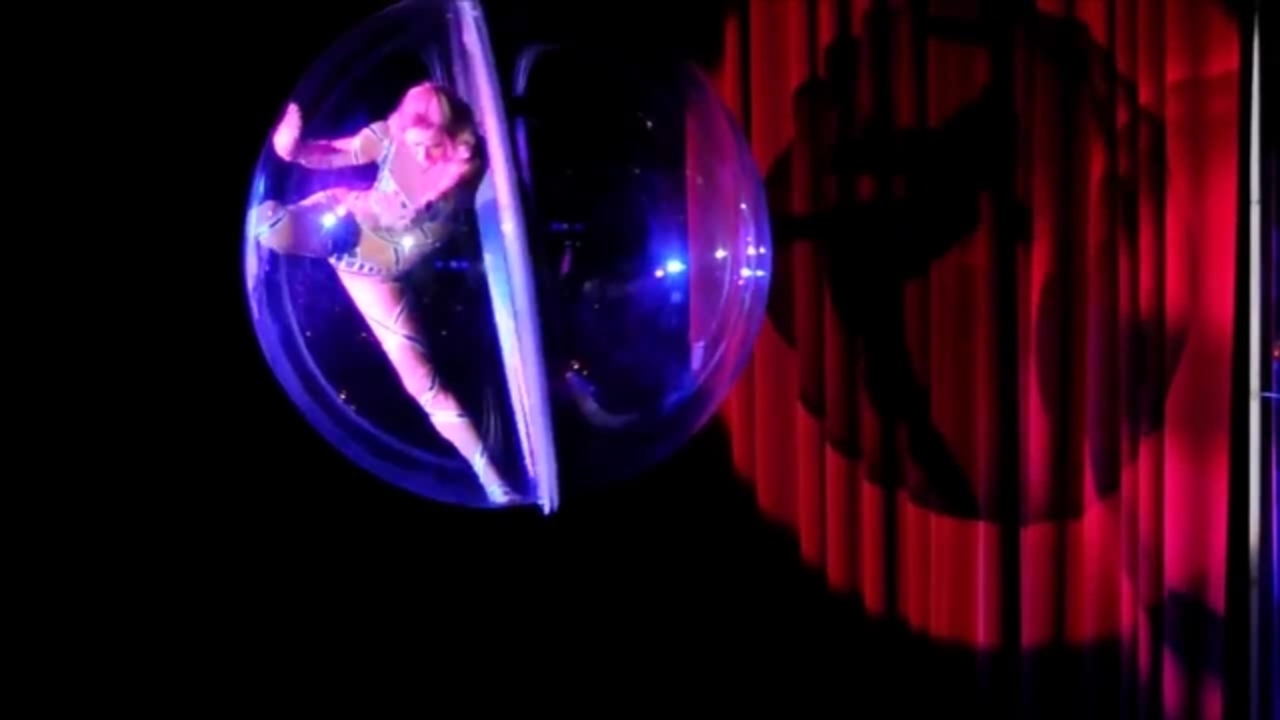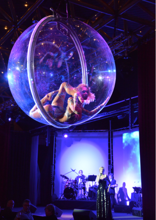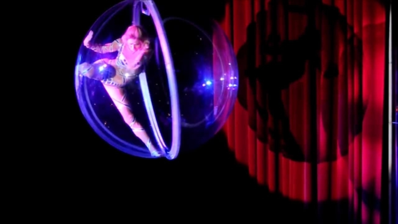 Our sphere aerial artist can adapt her performance to fit a great range of themes. She can add style and visual flair to her aerial performance by choosing the outfit that best fits your party and performing a custom choreography in coordination with the music chosen. Our versatile Sphere Aerialist is sure to deliver a unique aerial act that will have audiences raving.