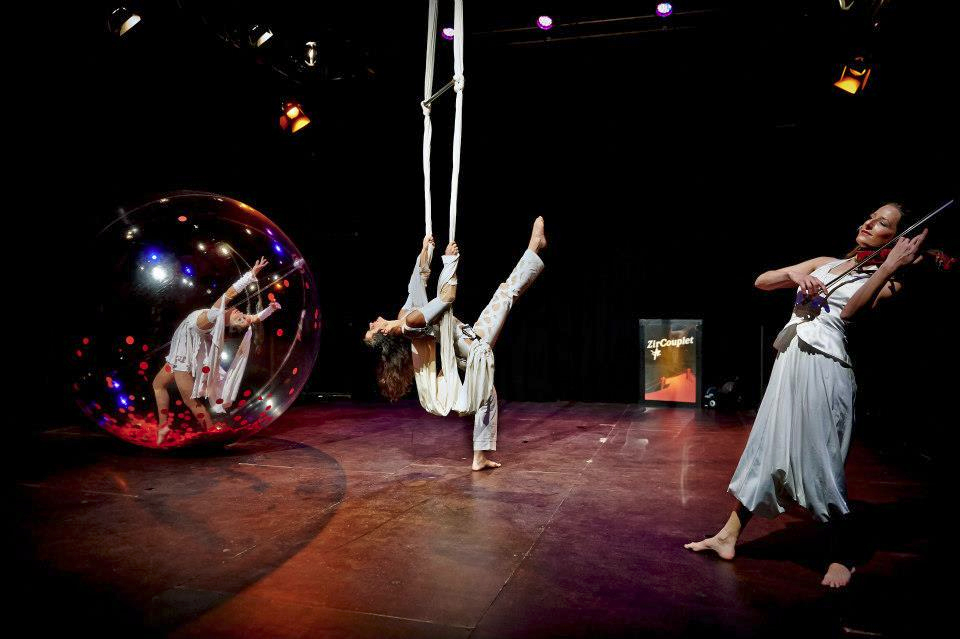 A trio with 1 aerialist, 1 violinist and 1 bubble dancer.