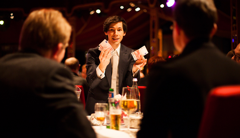 Happy to incorporate your corporate message into his performance and combine stage and roaming entertainment