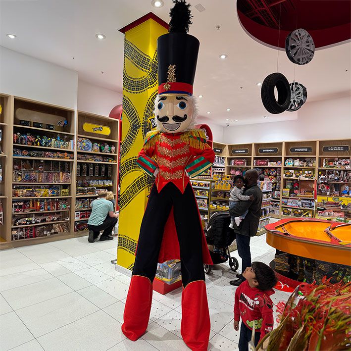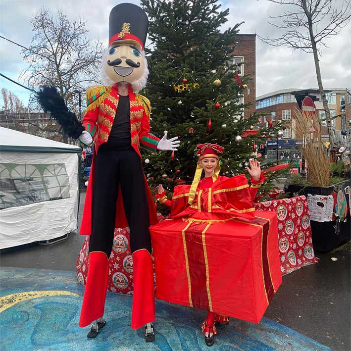 Towering above the crowd on stilts, the performer embodies the iconic toy soldier, creating a whimsical and magical atmosphere that captivates audiences of all ages.